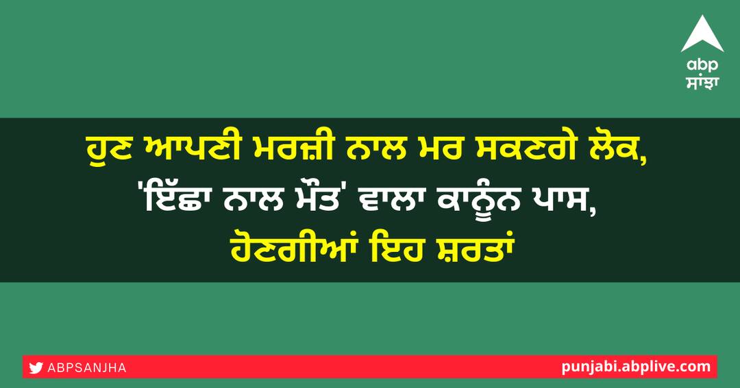Euthanasia in New Zealand: ਮਰਨਾ ਜੀਣਾ ਤਾਂ ਉਪਰ ਵਾਲੇ ਦੇ ਹੱਥ ਹੈ ਪਰ ਹੁਣ ਐਸਾ ਮੌਕਾ ਵੀ ਆ ਗਿਆ ਹੈ ਜਦੋਂ ਤੁਸੀਂ ਆਪਣੀ ਮਰਜ਼ੀ ਨਾਲ ਮੌਤ ਨੂੰ ਚੁਣ ਸਕਦੇ ਹੋ।ਨਿਊਜ਼ੀਲੈਂਡ ਵਿੱਚ ਐਤਵਾਰ ਸਵੇਰ ਤੋਂ ਇੱਛਾ ਨਾਲ ਮੌਤ ਵਾਲਾ ਕਾਨੂੰਨ ਲਾਗੂ ਹੋ ਗਿਆ ਹੈ। ਯਾਨੀ ਹੁਣ ਲੋਕ ਆਪਣੀ ਮਰਜ਼ੀ ਨਾਲ ਮਰ ਸਕਦੇ ਹਨ। ਇਸ ਤੋਂ ਪਹਿਲਾਂ ਕੋਲੰਬੀਆ, ਕੈਨੇਡਾ, ਆਸਟ੍ਰੇਲੀਆ, ਲਕਸਮਬਰਗ, ਸਪੇਨ, ਨੀਦਰਲੈਂਡ ਅਤੇ ਸਵਿਟਜ਼ਰਲੈਂਡ ਵਰਗੇ ਦੇਸ਼ਾਂ ਵਿੱਚ ਇੱਛਾ ਮੌਤ ਨੂੰ ਕਾਨੂੰਨੀ ਮਾਨਤਾ ਦਿੱਤੀ ਗਈ ਸੀ।