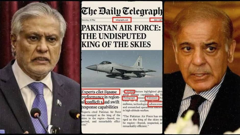ਪਾਕਿ ਵਿਦੇਸ਼ ਮੰਤਰੀ ਇਸਹਾਕ ਡਾਰ ਨੇ ਦਾਅਵਾ ਕੀਤਾ ਸੀ ਕਿ ਬ੍ਰਿਟੇਨ ਦੇ ਅਖਬਾਰ ਦ ਡੇਲੀ ਟੈਲੀਗ੍ਰਾਫ ਨੇ ਪਾਕਿਸਤਾਨ ਹਵਾਈ ਸੈਨਾ ਦੀ ਪ੍ਰਸ਼ੰਸਾ ਕੀਤੀ ਹੈ। ਉਨ੍ਹਾਂ ਦਾਅਵਾ ਕੀਤਾ ਕਿ ਦ ਡੇਲੀ ਟੈਲੀਗ੍ਰਾਫ ਨੇ ਪਾਕਿਸਤਾਨ ਹਵਾਈ ਸੈਨਾ ਦੀ ਪ੍ਰਸ਼ੰਸਾ ਕਰਦੇ ਹੋਏ ਇੱਕ ਲੇਖ ਪ੍ਰਕਾਸ਼ਿਤ ਕੀਤਾ ਸੀ ਅਤੇ ਕਿਹਾ ਸੀ ਕਿ ਇਹ ਸਕਾਈ ਕਿੰਗ ਸੀ, ਪਰ ਇਸ਼ਾਕ ਡਾਰ ਦੇ ਇਸ ਦਾਅਵੇ ਨੂੰ ਉਨ੍ਹਾਂ ਦੇ ਦੇਸ਼ ਦੇ ਅਖਬਾਰ ਦ ਡਾਨ ਨੇ ਝੂਠਾ ਕਰਾਰ ਦਿੱਤਾ। Dawn ਨੇ ਇਸ ਤੱਥ ਰਾਹੀਂ ਸਮਝਾਇਆ ਕਿ ਇਹ ਇੱਕ AI ਦੁਆਰਾ ਤਿਆਰ ਕੀਤੀ ਗਈ ਫੋਟੋ ਸੀ।