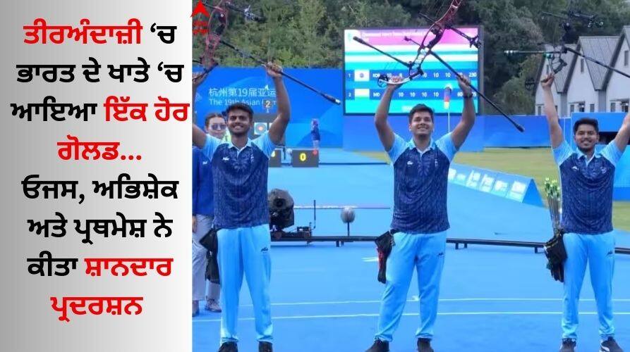 Asian Games 2023: ਭਾਰਤ ਦੇ ਖਾਤੇ ਵਿੱਚ ਇੱਕ ਹੋਰ ਗੋਲਡ ਆ ਗਿਆ ਹੈ। ਤੀਰਅੰਦਾਜ਼ੀ ਵਿੱਚ ਓਜਸ ਦੇਵਤਾਲੇ, ਅਭਿਸ਼ੇਕ ਵਰਮਾ ਅਤੇ ਪ੍ਰਥਮੇਸ਼ ਜਾਵਕਰ ਨੇ ਭਾਰਤ ਦੇ ਨਾਂਅ ਇਹ ਖਿਤਾਬ ਕੀਤਾ ਹੈ। ਦਰਅਸਲ, ਇਨ੍ਹਾਂ ਜੋੜੀ ਨੇ ਮਿਲ ਭਾਰਤ ਦੇ ਨਾਂਅ ਇੱਕ ਹੋਰ ਗੋਲਡ ਮੈਡਲ ਦਾ ਖਿਤਾਬ ਜਿੱਤਿਆ ਹੈ। ਭਾਰਤ ਲਈ ਇਹ ਕੁੱਲ 21ਵਾਂ ਗੋਲਡ ਮੈਡਲ ਸੀ। ਓਜਸ, ਅਭਿਸ਼ੇਕ ਵਰਮਾ ਅਤੇ ਪ੍ਰਥਮੇਸ਼ ਦੀ ਤਿਕੜੀ ਨੇ ਪੁਰਸ਼ਾਂ ਦੇ ਕੰਪਾਊਂਡ ਟੀਮ ਮੁਕਾਬਲੇ ਦੇ ਫਾਈਨਲ ਵਿੱਚ ਦੱਖਣੀ ਕੋਰੀਆ ਦੀ ਟੀਮ ਨੂੰ 235-230 ਨਾਲ ਹਰਾ ਕੇ ਸੋਨ ਤਗ਼ਮਾ ਜਿੱਤਿਆ। ਭਾਰਤ ਲਈ ਇਹ ਕੁੱਲ 84ਵਾਂ ਮੈਡਲ ਸੀ।