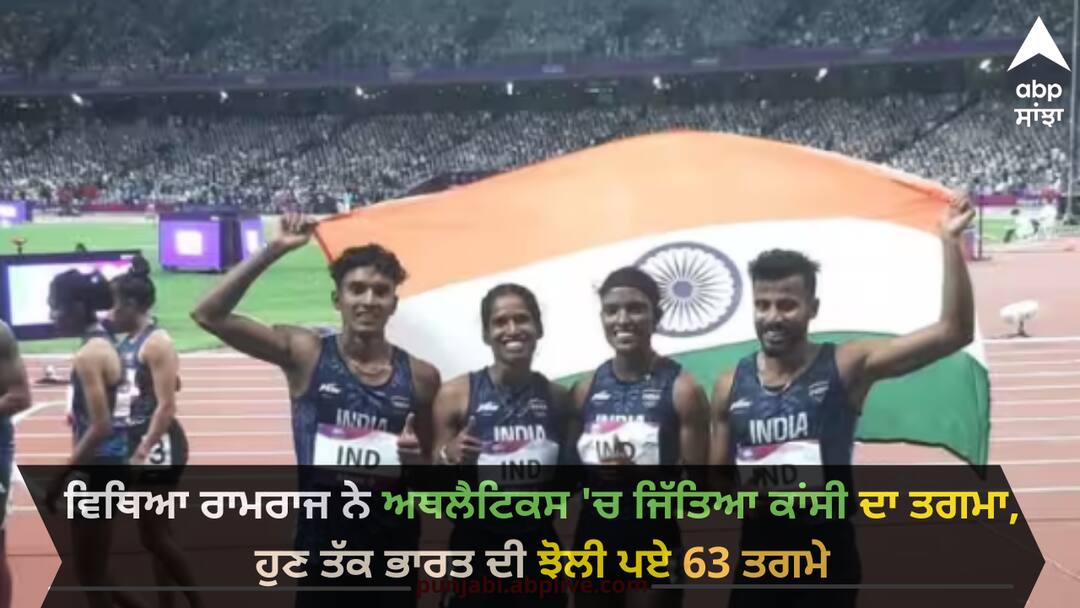 Vithya Ramraj Bronze In Asian Games: ਏਸ਼ੀਆਈ ਖੇਡਾਂ ਵਿੱਚ ਭਾਰਤੀ ਖਿਡਾਰੀਆਂ ਦਾ ਦਬਦਬਾ ਬਰਕਰਾਰ ਹੈ। ਹੁਣ ਭਾਰਤੀ ਅਥਲੀਟ ਵਿਥਿਆ ਰਾਮਰਾਜ ਨੇ 400 ਮੀਟਰ ਹਰਡਲ ਵਿੱਚ ਕਾਂਸੀ ਦਾ ਤਗ਼ਮਾ ਜਿੱਤ ਲਿਆ ਹੈ। ਵਿਥਿਆ ਰਾਮਰਾਜ ਨੇ 55.68 ਦੇ ਸਮੇਂ ਵਿੱਚ ਭਾਰਤ ਲਈ ਕਾਂਸੀ ਦਾ ਤਗਮਾ ਜਿੱਤਿਆ। ਇਸ ਤਰ੍ਹਾਂ ਭਾਰਤ ਦੇ ਮੈਡਲਾਂ ਦੀ ਗਿਣਤੀ 63 ਹੋ ਗਈ ਹੈ। ਹੁਣ ਤੱਕ 13 ਸੋਨ ਤਗਮਿਆਂ ਤੋਂ ਇਲਾਵਾ ਭਾਰਤੀ ਖਿਡਾਰੀਆਂ ਨੇ 24 ਚਾਂਦੀ ਦੇ ਤਗਮੇ ਅਤੇ 26 ਕਾਂਸੀ ਦੇ ਤਗਮੇ ਜਿੱਤੇ ਹਨ।