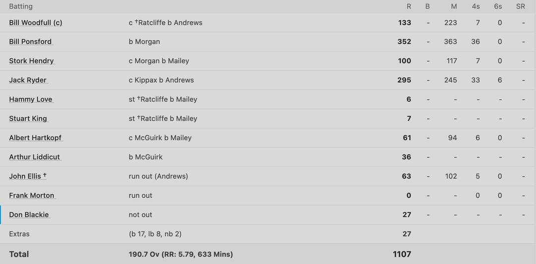ਨਿਊ ਸਾਊਥ ਵੇਲਜ਼ ਅਤੇ ਵਿਕਟੋਰੀਆ ਵਿਚਾਲੇ ਖੇਡੇ ਗਏ ਮੈਚ 'ਚ ਨਿਊ ਸਾਊਥ ਵੇਲਜ਼ ਨੇ ਪਹਿਲਾਂ ਬੱਲੇਬਾਜ਼ੀ ਕਰਦੇ ਹੋਏ ਪਹਿਲੀ ਪਾਰੀ 'ਚ 221 ਦੌੜਾਂ ਬਣਾਈਆਂ। ਇਸ ਤੋਂ ਬਾਅਦ ਅੱਜ ਤੱਕ ਕੋਈ ਵੀ ਟੀਮ ਉਹ ਨਹੀਂ ਕਰ ਸਕੀ ਜੋ ਵਿਕਟੋਰੀਆ ਨੇ ਆਪਣੀ ਪਹਿਲੀ ਪਾਰੀ ਵਿੱਚ ਕੀਤਾ ਸੀ। ਇਸ ਮੈਚ ਵਿੱਚ ਵਿਕਟੋਰੀਆ ਲਈ ਬਿਲ ਵੁੱਡਫੁੱਲ ਨੇ 133, ਬਿਲ ਪੋਂਸਫੋਰਡ ਨੇ 352, ਸਟੋਰਕ ਹੈਂਡਰੀ ਨੇ 100 ਅਤੇ ਜੈਕ ਰਾਈਡਰ ਨੇ 295 ਦੌੜਾਂ ਬਣਾਈਆਂ।