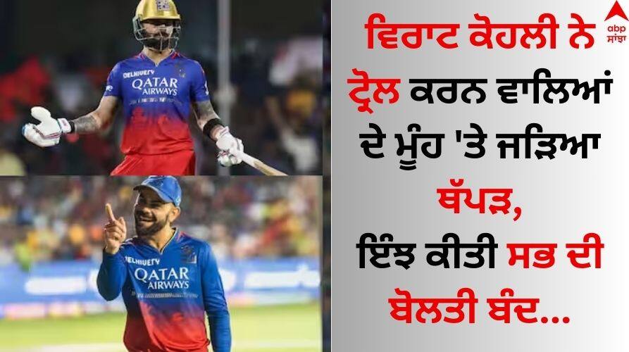Virat Kohli, IPL 2024: ਵਿਰਾਟ ਕੋਹਲੀ ਨੂੰ ਟੀ-20 ਵਰਲਡ ਕੱਪ 2024 ਤੋਂ ਪਹਿਲਾਂ ਆਪਣੇ ਸਟ੍ਰਾਈਕ ਰੇਟ ਲਈ ਜ਼ਬਰਦਸਤ ਟ੍ਰੋਲ ਕੀਤਾ ਜਾ ਰਿਹਾ ਹੈ। ਇਹ ਉਦੋਂ ਤੋਂ ਹੈ ਜਦੋਂ ਕੋਹਲੀ ਇਸ ਸੀਜ਼ਨ ਵਿੱਚ 147.49 ਦੀ ਸਟ੍ਰਾਈਕ ਰੇਟ ਨਾਲ ਖੇਡ ਰਹੇ ਹਨ। ਕੋਹਲੀ ਨੇ ਮੌਜੂਦਾ ਸੀਜ਼ਨ 'ਚ 10 ਮੈਚ ਖੇਡਦੇ ਹੋਏ ਹੁਣ ਤੱਕ 71.43 ਦੀ ਸ਼ਾਨਦਾਰ ਔਸਤ ਨਾਲ 500 ਦੌੜਾਂ ਬਣਾਈਆਂ ਹਨ। ਉਨ੍ਹਾਂ ਨੇ ਗੁਜਰਾਤ ਟਾਈਟਨਜ਼ ਖ਼ਿਲਾਫ਼ 44 ਗੇਂਦਾਂ ਵਿੱਚ 70 ਦੌੜਾਂ ਬਣਾ ਕੇ ਆਰਸੀਬੀ ਦੀ 9 ਵਿਕਟਾਂ ਨਾਲ ਵੱਡੀ ਜਿੱਤ ਵਿੱਚ ਅਹਿਮ ਯੋਗਦਾਨ ਪਾਇਆ। ਹੁਣ ਉਨ੍ਹਾਂ ਨੇ ਆਪਣੇ ਆਲੋਚਕਾਂ ਨੂੰ ਕਰਾਰਾ ਜਵਾਬ ਦਿੱਤਾ ਹੈ ਕਿ ਉਨ੍ਹਾਂ ਦਾ ਮਕਸਦ ਹਮੇਸ਼ਾ ਟੀਮ ਨੂੰ ਜਿੱਤ ਦਿਵਾਉਣਾ ਹੈ, ਚਾਹੇ ਲੋਕ ਇਸ ਬਾਰੇ ਕੁਝ ਵੀ ਬੋਲਣ।