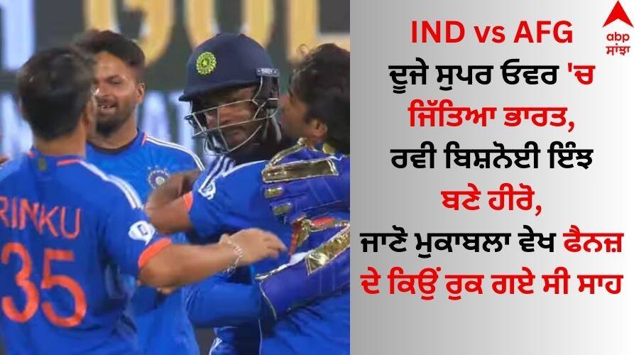 ਸਕੋਰ ਬਰਾਬਰ ਹੋਣ ਤੋਂ ਬਾਅਦ, ਦੋਵੇਂ ਟੀਮਾਂ ਮੈਚ ਦਾ ਨਤੀਜਾ ਤੈਅ ਕਰਨ ਲਈ ਸੁਪਰ ਓਵਰ ਲਈ ਮੈਦਾਨ ਵਿਚ ਉਤਰੀਆਂ। ਪਹਿਲਾਂ ਬੱਲੇਬਾਜ਼ੀ ਕਰਦੇ ਹੋਏ ਅਫਗਾਨਿਸਤਾਨ ਨੇ 1 ਵਿਕਟ 'ਤੇ 16 ਦੌੜਾਂ ਬਣਾਈਆਂ ਸਨ। ਭਾਰਤ ਲਈ ਮੁਕੇਸ਼ ਕੁਮਾਰ ਨੇ ਪਹਿਲਾ ਸੁਪਰ ਓਵਰ ਸੁੱਟਿਆ। 17 ਦੌੜਾਂ ਦੇ ਟੀਚੇ ਦਾ ਪਿੱਛਾ ਕਰਨ ਆਈ ਟੀਮ ਇੰਡੀਆ ਸਿਰਫ 16 ਦੌੜਾਂ ਹੀ ਬਣਾ ਸਕੀ ਅਤੇ ਸੁਪਰ ਵੀ ਬਰਾਬਰੀ 'ਤੇ ਖਤਮ ਹੋ ਗਿਆ। ਇਸ ਦੌਰਾਨ ਅਫਗਾਨਿਸਤਾਨ ਲਈ ਅਜ਼ਮਤੁੱਲਾ ਨੇ ਓਵਰ ਸੁੱਟਿਆ। ਭਾਰਤ ਨੂੰ ਜਿੱਤ ਲਈ ਆਖਰੀ ਗੇਂਦ 'ਤੇ 2 ਦੌੜਾਂ ਦੀ ਲੋੜ ਸੀ ਪਰ ਸਟ੍ਰਾਈਕ 'ਤੇ ਚੱਲ ਰਹੀ ਯਸ਼ਸਵੀ ਜੈਸਵਾਲ ਸਿਰਫ 1 ਦੌੜਾਂ ਹੀ ਬਣਾ ਸਕੀ।