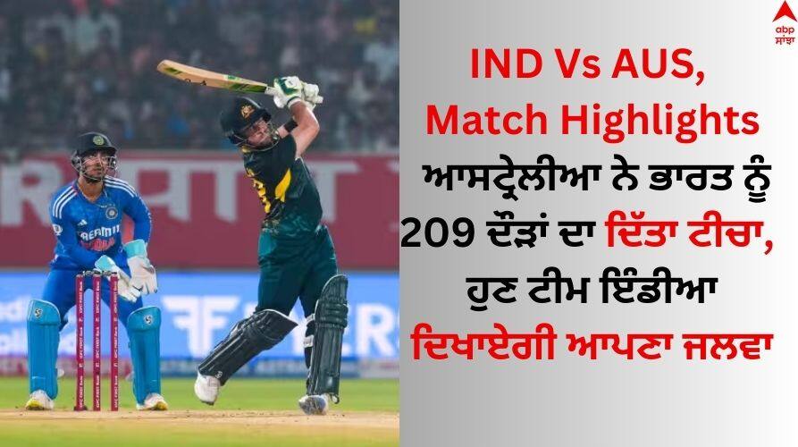 IND Vs AUS, Match Highlights: ਭਾਵੇਂ ਫਾਰਮੈਟ ਬਦਲ ਗਿਆ ਹੈ, ਭਾਰਤ 'ਤੇ ਆਸਟ੍ਰੇਲੀਆਈ ਟੀਮ ਦਾ ਦਬਦਬਾ ਨਹੀਂ ਬਦਲਿਆ ਹੈ। ਵਿਸ਼ਵ ਕੱਪ ਫਾਈਨਲ 'ਚ ਭਾਰਤ ਤੋਂ ਹਰਾ ਕੇ ਖਿਤਾਬ ਖੋਹਣ ਵਾਲੇ ਆਸਟ੍ਰੇਲੀਆ ਨੇ ਵਿਸ਼ਾਖਾਪਟਨਮ 'ਚ ਖੇਡੇ ਜਾ ਰਹੇ 5 ਮੈਚਾਂ ਦੀ ਟੀ-20 ਸੀਰੀਜ਼ ਦੇ ਪਹਿਲੇ ਮੈਚ 'ਚ ਪਹਿਲਾਂ ਬੱਲੇਬਾਜ਼ੀ ਕਰਦੇ ਹੋਏ 20 ਓਵਰਾਂ 'ਚ 3 ਵਿਕਟਾਂ 'ਤੇ 208 ਦੌੜਾਂ ਬਣਾਈਆਂ। ਟੀਮ ਲਈ ਜੋਸ਼ ਇੰਗਲਿਸ਼ ਨੇ 110 ਦੌੜਾਂ ਅਤੇ ਸਟੀਵ ਸਮਿਥ ਨੇ 220 ਦੇ ਸਟ੍ਰਾਈਕ ਰੇਟ ਨਾਲ 52 ਦੌੜਾਂ ਬਣਾਈਆਂ। ਭਾਰਤ ਲਈ ਬਿਸ਼ਨੋਈ ਅਤੇ ਕ੍ਰਿਸ਼ਨਾ ਨੇ 1-1 ਵਿਕਟ ਲਿਆ। ਵਿਸ਼ਾਖਾਪਟਨਮ ਦੇ ਰਾਜਸ਼ੇਖਰ ਰੈੱਡੀ ਕ੍ਰਿਕਟ ਸਟੇਡੀਅਮ 'ਚ ਖੇਡੇ ਜਾ ਰਹੇ ਮੈਚ 'ਚ ਟਾਸ ਹਾਰਨ ਤੋਂ ਬਾਅਦ ਆਸਟ੍ਰੇਲੀਆਈ ਕਪਤਾਨ ਮੈਥਿਊ ਵੇਡ ਨੇ ਕਿਹਾ ਸੀ ਕਿ ਅਸੀਂ ਟਾਸ ਜਿੱਤ ਕੇ ਪਹਿਲਾਂ ਗੇਂਦਬਾਜ਼ੀ ਕਰਦੇ, ਪਰ ਕੰਗਾਰੂ ਬੱਲੇਬਾਜ਼ਾਂ ਨੇ ਬੱਲੇਬਾਜ਼ੀ ਨੂੰ ਆਪਣੇ 'ਤੇ ਹਾਵੀ ਨਹੀਂ ਹੋਣ ਦਿੱਤਾ। ਕੰਗਾਰੂ ਟੀਮ ਨੂੰ ਪਹਿਲਾ ਝਟਕਾ 5ਵੇਂ ਓਵਰ 'ਚ ਹੀ ਲੱਗਾ ਪਰ ਇਸ ਤੋਂ ਬਾਅਦ ਜੋਸ਼ ਇੰਗਲਿਸ ਅਤੇ ਸਟੀਵ ਸਮਿਥ ਨੇ ਦੂਜੇ ਵਿਕਟ ਲਈ 66 ਗੇਂਦਾਂ 'ਚ 130 ਦੌੜਾਂ ਦੀ ਤੇਜ਼ ਸਾਂਝੇਦਾਰੀ ਕੀਤੀ।