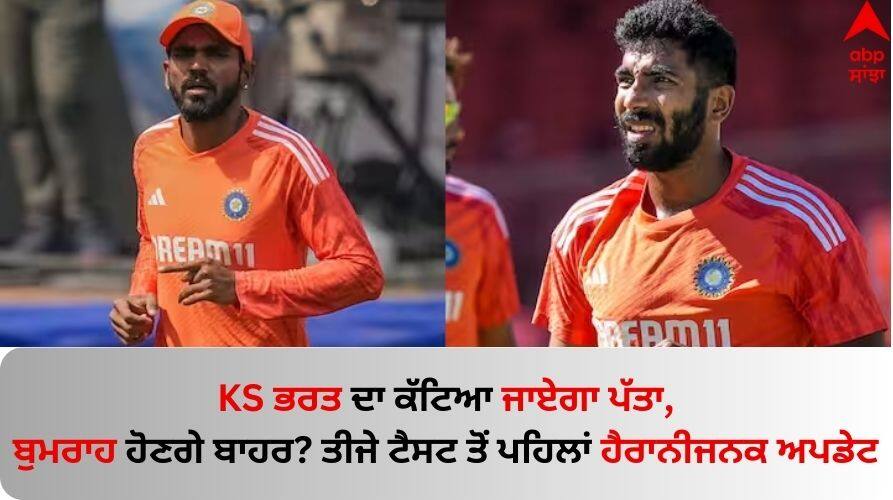 IND vs AUS 3rd Rajkot Test: ਭਾਰਤ ਅਤੇ ਇੰਗਲੈਂਡ ਵਿਚਾਲੇ ਪੰਜ ਮੈਚਾਂ ਦੀ ਟੈਸਟ ਸੀਰੀਜ਼ ਦਾ ਤੀਜਾ ਮੁਕਾਬਲਾ ਰਾਜਕੋਟ 'ਚ 15 ਫਰਵਰੀ ਤੋਂ ਖੇਡਿਆ ਜਾਣਾ ਹੈ। ਹੁਣ ਤੱਕ ਦੋ ਮੈਚਾਂ ਤੋਂ ਬਾਅਦ ਸੀਰੀਜ਼ 1-1 ਨਾਲ ਬਰਾਬਰ ਹੈ। ਪਰ ਤੀਜੇ ਟੈਸਟ ਤੋਂ ਪਹਿਲਾਂ ਟੀਮ ਇੰਡੀਆ 'ਚ ਕਈ ਬਦਲਾਅ ਦੇ ਬਾਰੇ 'ਚ ਅਹਿਮ ਅਪਡੇਟਸ ਸਾਹਮਣੇ ਆਏ ਹਨ ਜੋ ਸੱਚਮੁੱਚ ਹੈਰਾਨ ਕਰਨ ਵਾਲੇ ਹਨ। ਜਿਵੇਂ- ਕੇਐਸ ਭਰਤ ਅਤੇ ਬੁਮਰਾਹ ਬਾਹਰ ਹੋ ਸਕਦੇ ਹਨ। ਤਾਂ ਆਓ ਜਾਣਦੇ ਹਾਂ ਕੀ ਹੈ ਪੂਰਾ ਮਾਮਲਾ।