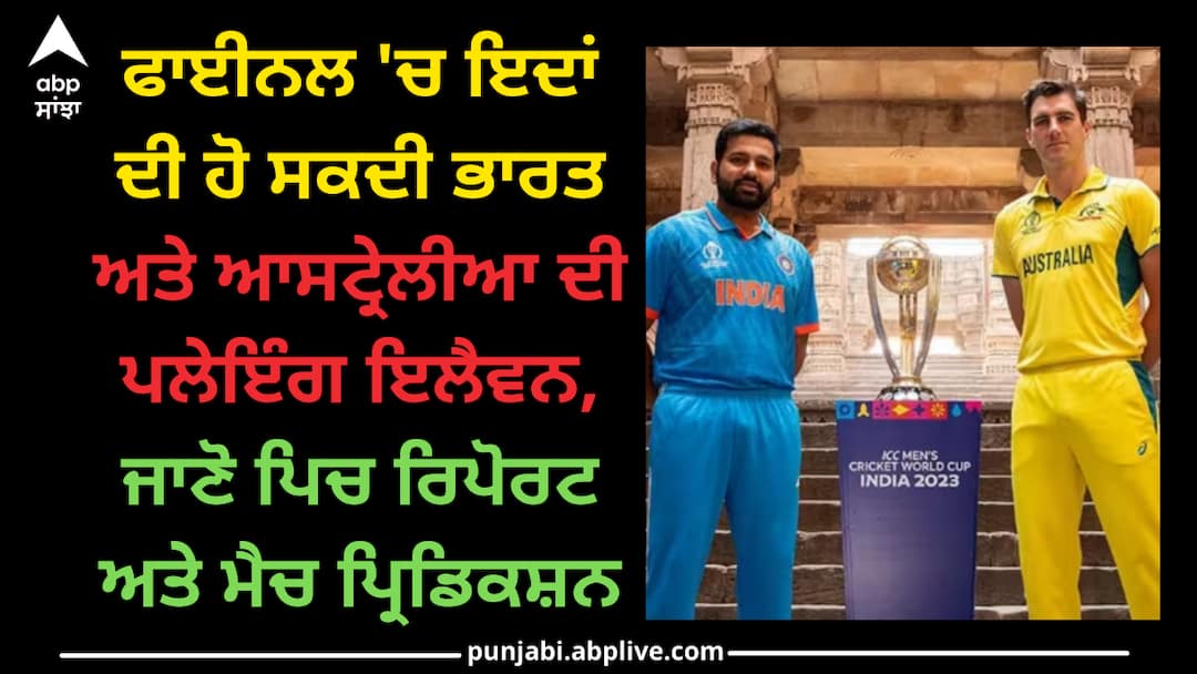 IND vs AUS World Cup 2023 Final: ਭਾਰਤ ਅਤੇ ਆਸਟ੍ਰੇਲੀਆ ਦੀਆਂ ਟੀਮਾਂ ਵਨਡੇ ਵਿਸ਼ਵ ਕੱਪ 2023 ਦੇ ਫਾਈਨਲ ਮੈਚ ਲਈ ਕਿਸੇ ਵੀ ਤਰ੍ਹਾਂ ਦੀ ਲਾਪਰਵਾਹੀ ਨਹੀਂ ਕਰਨਾ ਚਾਹੁਣਗੀਆਂ। ਦੋਵੇਂ ਟੀਮਾਂ ਪਿੱਚ ਅਤੇ ਕੰਡੀਸ਼ਨ ਦੇ ਹਿਸਾਬ ਨਾਲ ਆਪਣੀ ਬੈਸਟ ਪਲੇਇੰਗ ਇਲੈਵਨ ਨਾਲ ਮੈਦਾਨ 'ਚ ਉਤਰਨਾ ਚਾਹੁਣਗੀਆਂ। ਟੂਰਨਾਮੈਂਟ ਦਾ ਖ਼ਿਤਾਬੀ ਮੁਕਾਬਲਾ ਭਲਕੇ (19 ਨਵੰਬਰ) ਅਹਿਮਦਾਬਾਦ ਦੇ ਨਰਿੰਦਰ ਮੋਦੀ ਸਟੇਡੀਅਮ ਵਿੱਚ ਖੇਡਿਆ ਜਾਵੇਗਾ। ਇਸ ਤੋਂ ਪਹਿਲਾਂ ਆਓ ਜਾਣਦੇ ਹਾਂ ਕਿ ਫਾਈਨਲ 'ਚ ਦੋਵਾਂ ਟੀਮਾਂ ਦੀ ਪਲੇਇੰਗ ਇਲੈਵਨ, ਪਿੱਚ ਰਿਪੋਰਟ ਅਤੇ ਭਵਿੱਖਬਾਣੀ ਕੀ ਹੋਵੇਗੀ।