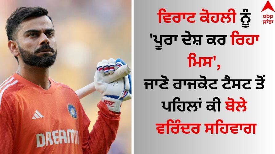 Virender Sehwag On Virat Kohli: ਭਾਰਤ ਅਤੇ ਇੰਗਲੈਂਡ ਵਿਚਾਲੇ ਪੰਜ ਮੈਚਾਂ ਦੀ ਟੈਸਟ ਸੀਰੀਜ਼ ਦਾ ਤੀਜਾ ਮੁਕਾਬਲਾ ਅੱਜ (15 ਫਰਵਰੀ) ਤੋਂ ਰਾਜਕੋਟ ਵਿੱਚ ਖੇਡਿਆ ਜਾਵੇਗਾ। ਰਾਜਕੋਟ ਟੈਸਟ ਵਿੱਚ ਭਾਰਤੀ ਟੀਮ ਇੱਕ ਵਾਰ ਫਿਰ ਵਿਰਾਟ ਕੋਹਲੀ ਦੇ ਬਿਨਾਂ ਮੈਦਾਨ ਵਿੱਚ ਉਤਰੇਗੀ। ਕੋਹਲੀ ਇੰਗਲੈਂਡ ਖਿਲਾਫ ਪੂਰੀ ਸੀਰੀਜ਼ 'ਚ ਟੀਮ ਇੰਡੀਆ ਦਾ ਹਿੱਸਾ ਨਹੀਂ ਹਨ। ਵਿਰਾਟ ਕੋਹਲੀ ਬਾਰੇ ਸਾਬਕਾ ਭਾਰਤੀ ਬੱਲੇਬਾਜ਼ ਵਰਿੰਦਰ ਸਹਿਵਾਗ ਨੇ ਕਿਹਾ ਕਿ ਪੂਰਾ ਦੇਸ਼ ਉਸ ਦੀ ਕਮੀ ਮਹਿਸੂਸ ਕਰ ਰਿਹਾ ਹੈ।