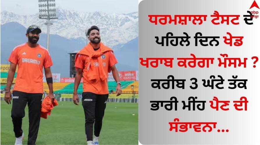 Dharamsala Test Weather Forecast Day 1: ਭਾਰਤ ਅਤੇ ਇੰਗਲੈਂਡ ਵਿਚਾਲੇ ਸੀਰੀਜ਼ ਦਾ ਪੰਜਵਾਂ ਟੈਸਟ ਮੈਚ ਵੀਰਵਾਰ 07 ਮਾਰਚ ਤੋਂ ਧਰਮਸ਼ਾਲਾ 'ਚ ਖੇਡਿਆ ਜਾਵੇਗਾ। ਹੁਣ ਤੱਕ ਖੇਡੀ ਗਈ ਸੀਰੀਜ਼ ਦੇ ਚਾਰ ਮੈਚਾਂ 'ਚ ਕਿਸੇ ਤਰ੍ਹਾਂ ਦੀ ਕੋਈ ਸਮੱਸਿਆ ਨਹੀਂ ਆਈ ਹੈ ਪਰ ਧਰਮਸ਼ਾਲਾ ਟੈਸਟ ਪ੍ਰਸ਼ੰਸਕਾਂ ਲਈ ਚੰਗਾ ਸਾਬਤ ਨਹੀਂ ਹੋ ਸਕਦਾ ਹੈ। ਦਰਅਸਲ ਸੀਰੀਜ਼ ਦੇ ਇਸ ਆਖਰੀ ਮੈਚ 'ਚ ਖਰਾਬ ਮੌਸਮ ਦਰਸ਼ਕਾਂ ਦਾ ਮਜ਼ਾ ਖਰਾਬ ਕਰ ਸਕਦਾ ਹੈ। ਦੱਸਿਆ ਜਾ ਰਿਹਾ ਹੈ ਕਿ ਪਹਿਲੇ ਹੀ ਦਿਨ ਖਰਾਬ ਮੌਸਮ ਖੇਡ ਨੂੰ ਖਰਾਬ ਕਰ ਸਕਦਾ ਹੈ। ਤਾਂ ਆਓ ਜਾਣਦੇ ਹਾਂ ਮੌਸਮ ਕਿਹੋ ਜਿਹਾ ਰਹੇਗਾ।