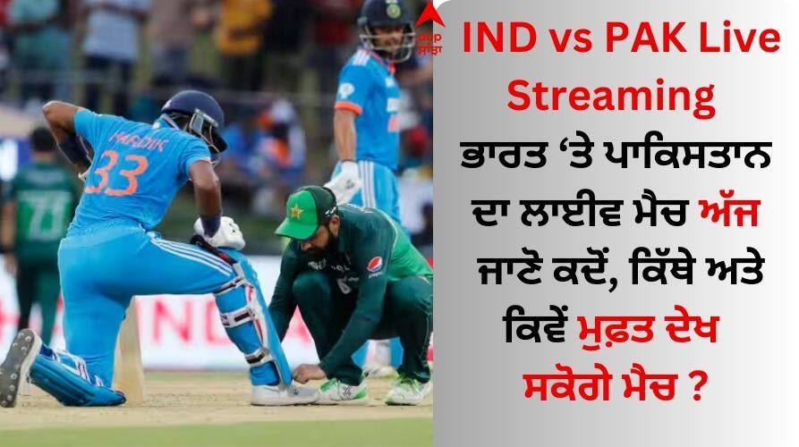 IND vs PAK Live Streaming And Telecast: ਏਸ਼ੀਆ ਕੱਪ 'ਚ ਅੱਜ (ਐਤਵਾਰ) ਇੱਕ ਵਾਰ ਫਿਰ ਭਾਰਤ ਅਤੇ ਪਾਕਿਸਤਾਨ ਵਿਚਾਲੇ ਜ਼ਬਰਦਸਤ ਮੁਕਾਬਲਾ ਦੇਖਣ ਨੂੰ ਮਿਲੇਗਾ। ਇਸ ਵਾਰ ਦੋਵੇਂ ਟੀਮਾਂ ਸੁਪਰ-4 ਵਿੱਚ ਇੱਕ-ਦੂਜੇ ਖ਼ਿਲਾਫ਼ ਮੈਦਾਨ ਵਿੱਚ ਉਤਰਨਗੀਆਂ। ਇਸ ਤੋਂ ਪਹਿਲਾਂ ਦੋਵਾਂ ਵਿਚਾਲੇ ਗਰੁੱਪ ਗੇੜ 'ਚ ਖੇਡਿਆ ਗਿਆ ਮੈਚ ਮੀਂਹ ਕਾਰਨ ਰੱਦ ਹੋ ਗਿਆ ਸੀ। ਦੋਵਾਂ ਵਿਚਾਲੇ ਸੁਪਰ-4 ਦਾ ਮੈਚ ਕੋਲੰਬੋ, ਸ਼੍ਰੀਲੰਕਾ 'ਚ ਖੇਡਿਆ ਜਾਵੇਗਾ। ਪ੍ਰਸ਼ੰਸਕ ਇਸ ਮੈਚ ਦਾ ਬੇਸਬਰੀ ਨਾਲ ਇੰਤਜ਼ਾਰ ਕਰ ਰਹੇ ਹਨ। ਇੱਥੇ ਜਾਣੋ ਤੁਸੀਂ ਇਹ ਮੈਚ ਕਦੋਂ, ਕਿੱਥੇ ਅਤੇ ਕਿਵੇਂ ਮੁਫ਼ਤ ਵਿੱਚ ਲਾਈਵ ਦੇਖ ਸਕਦੇ ਹੋ।