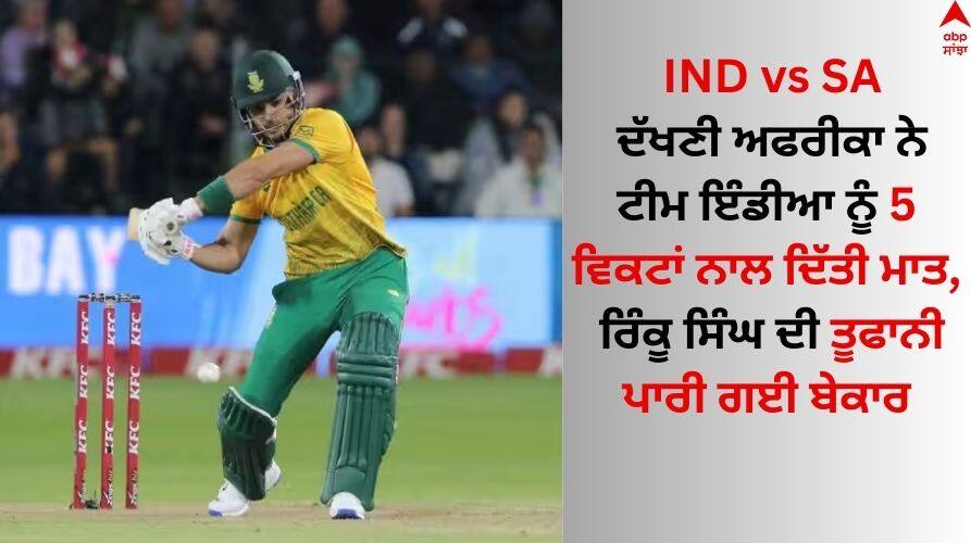 IND vs SA 2nd T20I Full Match Highlights: ਮੀਂਹ ਕਾਰਨ ਰੁਕੇ ਦੂਜੇ ਟੀ-20 ਵਿੱਚ ਦੱਖਣੀ ਅਫ਼ਰੀਕਾ ਨੇ ਭਾਰਤ ਨੂੰ 5 ਵਿਕਟਾਂ ਨਾਲ ਹਰਾਇਆ। ਇਸ ਮੈਚ ਵਿੱਚ ਭਾਰਤ ਨੇ ਪਹਿਲਾਂ ਖੇਡਦਿਆਂ ਰਿੰਕੂ ਸਿੰਘ ਅਤੇ ਸੂਰਿਆਕੁਮਾਰ ਦੇ ਤੂਫਾਨੀ ਅਰਧ ਸੈਂਕੜਿਆਂ ਦੀ ਬਦੌਲਤ 19.3 ਓਵਰਾਂ ਵਿੱਚ 180 ਦੌੜਾਂ ਬਣਾਈਆਂ ਸਨ। ਫਿਰ ਅਚਾਨਕ ਮੀਂਹ ਸ਼ੁਰੂ ਹੋ ਗਿਆ ਅਤੇ ਦੱਖਣੀ ਅਫਰੀਕਾ ਨੂੰ 15 ਓਵਰਾਂ ਵਿੱਚ 152 ਦੌੜਾਂ ਦਾ ਟੀਚਾ ਦਿੱਤਾ ਗਿਆ, ਜਿਸ ਨੂੰ ਮੇਜ਼ਬਾਨ ਟੀਮ ਨੇ ਸੱਤ ਗੇਂਦਾਂ ਵਿੱਚ ਪੰਜ ਵਿਕਟਾਂ ਗੁਆ ਕੇ ਹਾਸਲ ਕਰ ਲਿਆ।
