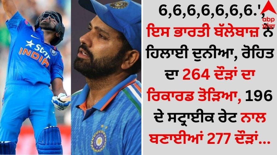 Rohit Sharma: ਭਾਰਤੀ ਕ੍ਰਿਕਟ ਟੀਮ ਦੇ ਮੌਜੂਦਾ ਕਪਤਾਨ ਹਿਟਮੈਨ ਰੋਹਿਤ ਸ਼ਰਮਾ ਨੇ ਸਾਲ 2014 'ਚ ਸ਼੍ਰੀਲੰਕਾ ਟੀਮ ਖਿਲਾਫ 264 ਦੌੜਾਂ ਦੀ ਪਾਰੀ ਖੇਡ ਕੇ ਕ੍ਰਿਕਟ ਜਗਤ 'ਚ ਹਲਚਲ ਮਚਾ ਦਿੱਤੀ ਸੀ ਅਤੇ ਹਰ ਪਾਸੇ ਸਿਰਫ ਉਨ੍ਹਾਂ ਦੀ ਹੀ ਚਰਚਾ ਹੋ ਰਹੀ ਸੀ। ਇਸ ਪਾਰੀ ਨੇ ਕ੍ਰਿਕਟ ਪ੍ਰੇਮੀਆਂ ਵਿਚਾਲੇ ਵੀ ਹਲਚਲ ਮਚਾ ਦਿੱਤੀ ਸੀ। ਪਰ ਹੁਣ ਉਨ੍ਹਾਂ ਦਾ ਇਹ ਰਿਕਾਰਡ ਟੁੱਟ ਗਿਆ ਹੈ ਅਤੇ ਇੱਕ ਹੋਰ ਭਾਰਤੀ ਬੱਲੇਬਾਜ਼ ਨੇ 196 ਦੇ ਸਟ੍ਰਾਈਕ ਰੇਟ ਨਾਲ 277 ਦੌੜਾਂ ਬਣਾਈਆਂ ਹਨ। ਤਾਂ ਆਓ ਜਾਣਦੇ ਹਾਂ ਰੋਹਿਤ ਸ਼ਰਮਾ ਦਾ ਰਿਕਾਰਡ ਤੋੜਨ ਵਾਲੇ ਖਿਡਾਰੀ ਬਾਰੇ।
