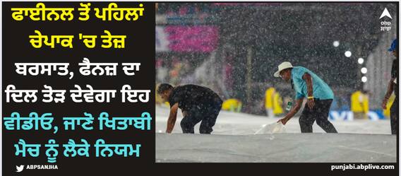 IPL Final 2024 Rain: IPL 2024 ਦਾ ਫਾਈਨਲ ਮੈਚ ਚੇਨਈ ਦੇ ਚੇਪੌਕ ਸਥਿਤ MA ਚਿਦੰਬਰਮ ਸਟੇਡੀਅਮ 'ਚ ਐਤਵਾਰ 26 ਮਈ ਨੂੰ ਖੇਡਿਆ ਜਾਵੇਗਾ। ਕੋਲਕਾਤਾ ਨਾਈਟ ਰਾਈਡਰਜ਼ ਅਤੇ ਸਨਰਾਈਜ਼ਰਸ ਹੈਦਰਾਬਾਦ ਦੀਆਂ ਟੀਮਾਂ ਖ਼ਿਤਾਬੀ ਲੜਾਈ ਵਿੱਚ ਇੱਕ ਦੂਜੇ ਨਾਲ ਭਿੜਨਗੀਆਂ। ਪਰ ਇਸ ਮੈਚ ਤੋਂ ਪਹਿਲਾਂ ਚੇਪਾਕ ਦੇ ਪ੍ਰਸ਼ੰਸਕਾਂ ਲਈ ਦਿਲ ਦਹਿਲਾ ਦੇਣ ਵਾਲੀ ਤਸਵੀਰ ਸਾਹਮਣੇ ਆਈ ਹੈ। ਦਰਅਸਲ, ਫਾਈਨਲ ਤੋਂ ਇੱਕ ਦਿਨ ਪਹਿਲਾਂ 25 ਮਈ ਸ਼ਨੀਵਾਰ ਨੂੰ ਚੇਪੌਕ ਵਿੱਚ ਭਾਰੀ ਮੀਂਹ ਪੈ ਰਿਹਾ ਹੈ। ਜੇਕਰ ਮੈਚ ਮੀਂਹ ਕਾਰਨ ਧੋਤਾ ਜਾਂਦਾ ਹੈ ਤਾਂ ਆਓ ਜਾਣਦੇ ਹਾਂ ਕਿ ਫਾਈਨਲ ਦਾ ਫੈਸਲਾ ਕਿਵੇਂ ਹੋਵੇਗਾ।