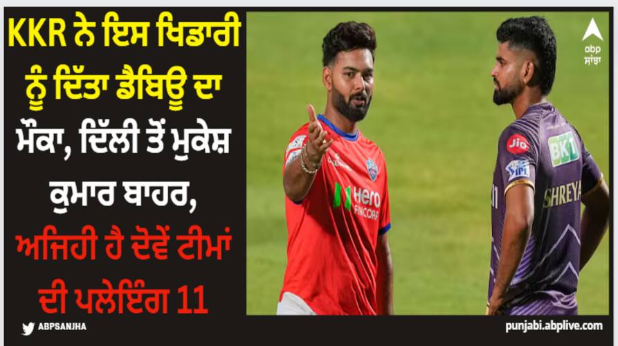 ਕੇਕੇਆਰ ਨੇ ਮੈਚ ਲਈ ਪਲੇਇੰਗ ਇਲੈਵਨ ਵਿੱਚ ਬਦਲਾਅ ਕੀਤਾ ਹੈ। ਉਥੇ ਹੀ ਦਿੱਲੀ ਕੈਪੀਟਲਸ 'ਚ ਮੁਕੇਸ਼ ਕੁਮਾਰ ਸੱਟ ਕਾਰਨ ਬਾਹਰ ਹਨ। ਕੇਕੇਆਰ ਨੇ ਅੰਗਕ੍ਰਿਸ਼ ਰਘੂਵੰਸ਼ੀ ਨੂੰ ਡੈਬਿਊ ਕਰਨ ਦਾ ਮੌਕਾ ਦਿੱਤਾ ਹੈ। ਸੁਮਿਤ ਕੁਮਾਰ ਦੀ ਥਾਂ ਮੁਕੇਸ਼ ਕੁਮਾਰ ਨੂੰ ਲਾਇਆ ਗਿਆ ਹੈ।