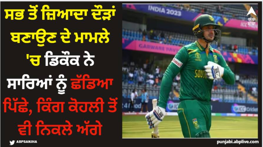 Most Runs in ICC Cricket World Cup 2023: 2023 ਇੱਕ ਰੋਜ਼ਾ ਵਿਸ਼ਵ ਕੱਪ ਦੇਸ਼ ਵਿੱਚ ਚੱਲ ਰਿਹਾ ਹੈ। ਕ੍ਰਿਕਟ ਦੇ ਇਸ ਮਹਾਕੁੰਭ 'ਚ ਕਈ ਵੱਡੇ ਰਿਕਾਰਡ ਬਣੇ ਅਤੇ ਟੁੱਟੇ। ਇਸ ਵਿਸ਼ਵ ਕੱਪ ਵਿੱਚ ਹੁਣ ਤੱਕ ਭਾਰਤ ਅਤੇ ਦੱਖਣੀ ਅਫਰੀਕਾ ਦੇ ਬੱਲੇਬਾਜ਼ਾਂ ਦਾ ਦਬਦਬਾ ਰਿਹਾ ਹੈ। ਦੱਖਣੀ ਅਫਰੀਕਾ ਦੇ ਬੱਲੇਬਾਜ਼ ਖਾਸ ਤੌਰ 'ਤੇ ਭਾਰਤ 'ਚ ਸ਼ਾਨਦਾਰ ਪ੍ਰਦਰਸ਼ਨ ਕਰ ਰਹੇ ਹਨ। 2023 ਵਿਸ਼ਵ ਕੱਪ ਵਿੱਚ ਸਭ ਤੋਂ ਵੱਧ ਦੌੜਾਂ ਬਣਾਉਣ ਵਾਲੇ ਬੱਲੇਬਾਜ਼ਾਂ ਦੀ ਸੂਚੀ ਵਿੱਚ ਦੱਖਣੀ ਅਫ਼ਰੀਕਾ ਦੇ ਕਈ ਖਿਡਾਰੀ ਸ਼ਾਮਲ ਹਨ।
