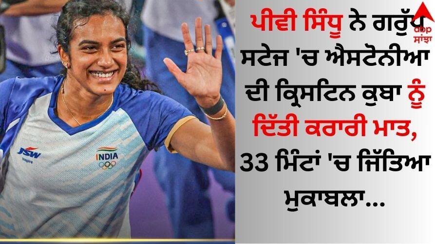 Paris Olympics: ਪੀਵੀ ਸਿੰਧੂ ਨੇ ਐਸਟੋਨੀਆ ਦੀ ਕ੍ਰਿਸਟੀਨਾ ਕੂਬਾ ਨੂੰ ਹਰਾ ਕੇ ਬੈਡਮਿੰਟਨ ਮਹਿਲਾ ਸਿੰਗਲਜ਼ ਦੇ ਰਾਊਂਡ ਆਫ 16 ਵਿੱਚ ਥਾਂ ਬਣਾ ਲਈ ਹੈ। ਭਾਰਤੀ ਬੈਡਮਿੰਟਨ ਸਟਾਰ ਨੇ ਕ੍ਰਿਸਟੀਨਾ ਕੁਬਾ ਨੂੰ 21-5, 21-10 ਨਾਲ ਹਰਾ ਕੇ ਰਾਉਂਡ ਆਫ 16 ਵਿੱਚ ਥਾਂ ਬਣਾਈ। ਰੀਓ ਓਲੰਪਿਕ 'ਚ ਚਾਂਦੀ ਦਾ ਤਗਮਾ ਅਤੇ ਟੋਕੀਓ 'ਚ ਕਾਂਸੀ ਦਾ ਤਮਗਾ ਜਿੱਤਣ ਵਾਲੀ ਸਿੰਧੂ ਨੇ ਇਹ ਇਕਤਰਫਾ ਮੈਚ 34 ਮਿੰਟ 'ਚ ਜਿੱਤ ਲਿਆ।