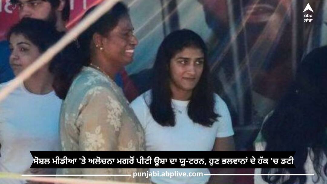 PT Usha meets protesting wrestlers: ਸੋਸ਼ਲ ਮੀਡੀਆ ਉੱਪਰ ਅਲੋਚਨਾ ਮਗਰੋਂ ਭਾਰਤੀ ਓਲੰਪਿਕ ਐਸੋਸੀਏਸ਼ਨ (ਆਈਓਏ) ਦੀ ਮੁਖੀ ਪੀਟੀ ਊਸ਼ਾ ਨੇ ਯੂ-ਟਰਨ ਲੈ ਲਿਆ ਹੈ। ਪੀਟੀ ਊਸ਼ਾ ਨੇ ਹੁਣ ਜੰਤਰ-ਮੰਤਰ ’ਤੇ ਧਰਨਾ ਦੇ ਰਹੇ ਭਲਵਾਨਾਂ ਦੀ ਹਮਾਇਤ ਦਾ ਐਲਾਨ ਕੀਤਾ ਹੈ। ਪਹਿਲਾਂ ਉਨ੍ਹਾਂ ਨੇ ਭਲਵਾਨਾਂ ਦੇ ਧਰਨੇ ਨੂੰ ਗਲਤ ਦੱਸਿਆ ਸੀ ਜਿਸ ਕਰਕੇ ਉਨ੍ਹਾਂ ਦੀ ਅਲੋਚਨਾ ਹੋਈ ਸੀ।