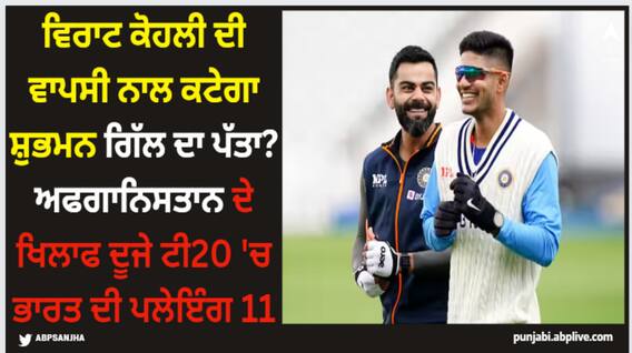Indian Team Playing XI: ਭਾਰਤ ਅਤੇ ਅਫਗਾਨਿਸਤਾਨ ਵਿਚਾਲੇ ਤਿੰਨ ਮੈਚਾਂ ਦੀ ਟੀ-20 ਸੀਰੀਜ਼ ਚੱਲ ਰਹੀ ਹੈ, ਜਿਸ ਦਾ ਪਹਿਲਾ ਮੈਚ ਮੋਹਾਲੀ 'ਚ ਖੇਡਿਆ ਗਿਆ ਹੈ। ਹੁਣ ਦੂਜਾ ਮੈਚ ਕੱਲ ਯਾਨੀ ਐਤਵਾਰ 14 ਜਨਵਰੀ ਨੂੰ ਇੰਦੌਰ 'ਚ ਖੇਡਿਆ ਜਾਵੇਗਾ, ਜਿਸ 'ਚ ਵਿਰਾਟ ਕੋਹਲੀ ਦੀ ਵਾਪਸੀ ਲਗਭਗ ਤੈਅ ਹੈ। ਪਹਿਲੇ ਮੈਚ ਵਿੱਚ ਕੋਹਲੀ ਨਿੱਜੀ ਕਾਰਨਾਂ ਕਰਕੇ ਭਾਰਤ ਦੇ ਪਲੇਇੰਗ ਇਲੈਵਨ ਵਿੱਚ ਸ਼ਾਮਲ ਨਹੀਂ ਹੋ ਸਕੇ ਸਨ। ਹੁਣ ਦੂਜੇ ਟੀ-20 ਵਿੱਚ ਕੋਹਲੀ ਦੀ ਵਾਪਸੀ ਨਾਲ ਸ਼ੁਭਮਨ ਗਿੱਲ ਦਾ ਪੱਤਾ ਕੱਟਿਆ ਜਾ ਸਕਦਾ ਹੈ। ਤਾਂ ਆਓ ਜਾਣਦੇ ਹਾਂ ਅਫਗਾਨਿਸਤਾਨ ਖਿਲਾਫ ਦੂਜੇ ਟੀ-20 'ਚ ਭਾਰਤ ਦੀ ਪਲੇਇੰਗ ਇਲੈਵਨ ਕਿਵੇਂ ਹੋ ਸਕਦੀ ਹੈ।