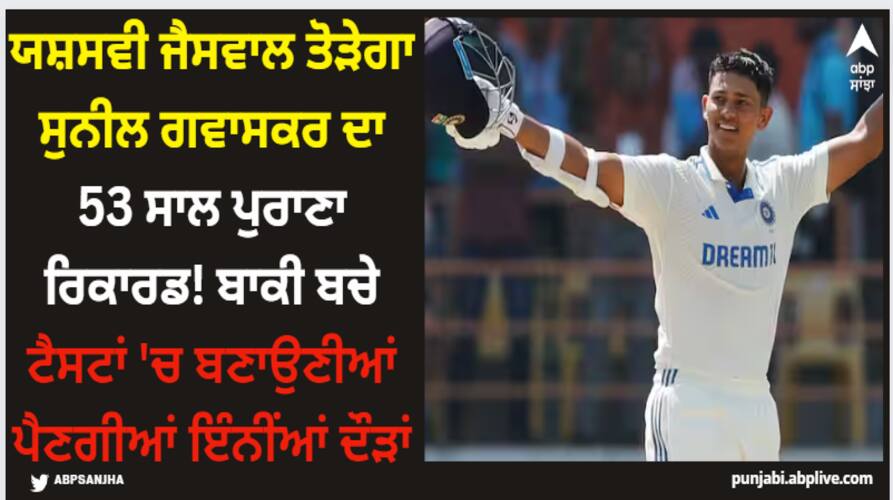 ਯਸ਼ਸਵੀ ਜੈਸਵਾਲ ਤੋੜਣਗੇ ਸੁਨੀਲ ਗਾਵਸਕਰ ਦਾ 53 ਸਾਲ ਪੁਰਾਣਾ ਰਿਕਾਰਡ!ਅਸਲ 'ਚ ਇਕ ਟੈਸਟ ਸੀਰੀਜ਼ 'ਚ ਸਭ ਤੋਂ ਜ਼ਿਆਦਾ ਦੌੜਾਂ ਬਣਾਉਣ ਵਾਲੇ ਭਾਰਤੀ ਬੱਲੇਬਾਜ਼ਾਂ ਦੀ ਸੂਚੀ 'ਚ ਸੁਨੀਲ ਗਾਵਸਕਰ ਚੋਟੀ 'ਤੇ ਹਨ। ਸੁਨੀਲ ਗਾਵਸਕਰ ਨੇ ਲਗਭਗ 53 ਸਾਲ ਪਹਿਲਾਂ ਵੈਸਟਇੰਡੀਜ਼ ਖਿਲਾਫ ਆਪਣੀ ਪਹਿਲੀ ਟੈਸਟ ਸੀਰੀਜ਼ 'ਚ 774 ਦੌੜਾਂ ਬਣਾਈਆਂ ਸਨ। ਜਿਸ ਵਿੱਚ ਲਿਟਲ ਮਾਸਟਰ ਨੇ 2 ਦੋਹਰੇ ਸੈਂਕੜੇ ਤੋਂ ਇਲਾਵਾ 4 ਸੈਂਕੜੇ ਲਗਾਏ ਸਨ। ਇਸ ਤੋਂ ਇਲਾਵਾ ਪੰਜਾਹ ਦੌੜਾਂ ਦਾ ਅੰਕੜਾ ਤਿੰਨ ਵਾਰ ਪਾਰ ਕੀਤਾ। ਉਸ ਸੀਰੀਜ਼ 'ਚ ਸੁਨੀਲ ਗਾਵਸਕਰ ਨੇ 154.80 ਦੀ ਔਸਤ ਨਾਲ ਦੌੜਾਂ ਬਣਾਈਆਂ ਸਨ।