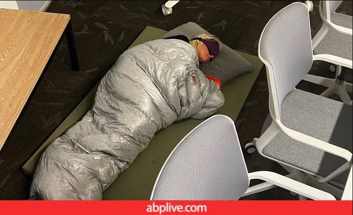 ਫੋਟੋ ਵਿੱਚ Esther Crawford ਨੂੰ ਕੁਰਸੀ ਦੇ ਮੇਜ਼ਾਂ ਦੇ ਵਿਚਕਾਰ, ਇੱਕ ਸਲੀਪਿੰਗ ਬੈਗ ਦੇ ਅੰਦਰ ਅਤੇ ਆਪਣੀਆਂ ਅੱਖਾਂ 'ਤੇ ਇੱਕ ਮਾਸਕ ਦੇ ਨਾਲ ਦਫਤਰ ਦੇ ਫਰਸ਼ 'ਤੇ ਸੌਂਦੇ ਦੇਖਿਆ ਜਾ ਸਕਦਾ ਹੈ।