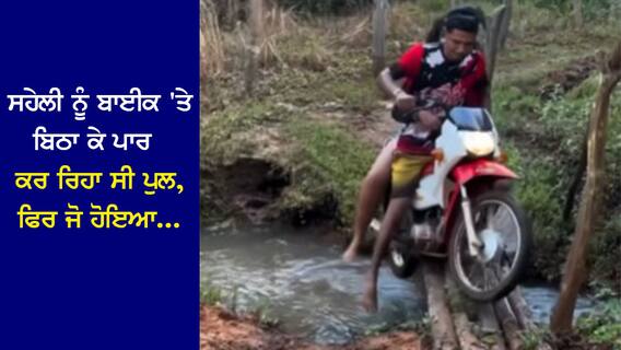 ਵੀਡੀਓ 'ਚ ਦੇਖਿਆ ਜਾ ਸਕਦਾ ਹੈ ਕਿ ਹੇਠਾਂ ਪਾਣੀ ਵਹਿ ਰਿਹਾ ਹੈ। ਇਸ ਦੇ ਉੱਪਰ ਸੈਰ ਕਰਨ ਲਈ 5 ਮੋਟੇ ਖੰਭੇ ਰੱਖੇ ਹੋਏ ਹਨ। ਇੱਕ ਆਦਮੀ ਆਪਣੀ ਪ੍ਰੇਮਿਕਾ ਨੂੰ ਪਿੱਛੇ ਬਿਠਾ ਕੇ ਹੌਂਡਾ ਬਾਈਕ ਚਲਾ ਰਿਹਾ ਹੈ। ਲੜਕੀ ਨੇ ਆਪਣੇ ਬੁਆਏਫ੍ਰੈਂਡ ਨੂੰ ਕੱਸ ਕੇ ਫੜਿਆ ਹੋਇਆ ਹੈ ਅਤੇ ਉਹ ਲੱਕੜ ਦੇ ਪੁਲ 'ਤੇ ਵਗਦੀ ਛੋਟੀ ਨਹਿਰ ਨੂੰ ਪਾਰ ਕਰਨ ਦੀ ਕੋਸ਼ਿਸ਼ ਕਰਦਾ ਹੈ। ਇਸ ਦੌਰਾਨ ਵਿਅਕਤੀ ਦੀ ਕਾਰ ਦਾ ਟਾਇਰ ਦੋ ਡੰਡਿਆਂ ਵਿਚਕਾਰ ਫਸ ਗਿਆ। ਫਿਰ ਵੀ ਉਹ ਤੇਜ਼ੀ ਨਾਲ ਪੁਲ ਤੋਂ ਛੁਟਕਾਰਾ ਪਾਉਣ ਦੀ ਕੋਸ਼ਿਸ਼ ਕਰਦਾ ਹੈ। ਇੱਕ ਪਲ ਲਈ ਲੱਗਦਾ ਹੈ ਕਿ ਉਹ ਪੁਲ ਪਾਰ ਕਰਨ ਵਿੱਚ ਕਾਮਯਾਬ ਹੋ ਜਾਵੇਗਾ। ਹਾਲਾਂਕਿ, ਅਜਿਹਾ ਨਹੀਂ ਹੁੰਦਾ ਹੈ।