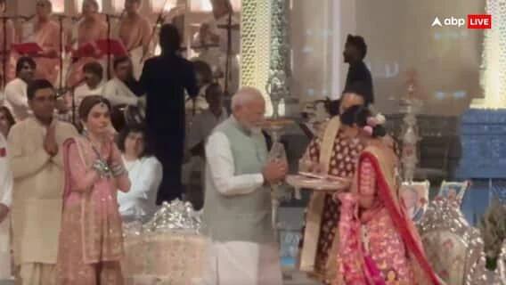 ਇਸ ਦੌਰਾਨ ਪ੍ਰਧਾਨ ਮੰਤਰੀ ਨਰਿੰਦਰ ਮੋਦੀ ਨੇ ਜੋੜੇ ਨੂੰ ਉਨ੍ਹਾਂ ਦੇ ਵਿਆਹ ਦੀ ਵਧਾਈ ਦਿੱਤੀ। ਇਸ ਦੇ ਨਾਲ ਹੀ ਪੀਐਮ ਨੇ ਉਨ੍ਹਾਂ ਨੂੰ ਇੱਕ ਤੋਹਫ਼ਾ ਦਿੱਤਾ, ਜਿਸ ਵਿੱਚ ਇੱਕ ਪਲੇਟ ਵਿੱਚ ਕੁਝ ਚੀਜ਼ਾਂ ਰੱਖੀਆਂ ਹੋਈਆਂ ਸਨ। ਜਿਸ ਨੂੰ ਅਨੰਤ ਅੰਬਾਨੀ ਨੇ ਆਪਣੇ ਮੱਥੇ 'ਤੇ ਲਗਾਇਆ ਅਤੇ ਫਿਰ ਰਾਧਿਕਾ ਨੂੰ ਵੀ ਆਪਣੇ ਮੱਥੇ 'ਤੇ ਲਗਾਉਣ ਲਈ ਕਿਹਾ। ਬਾਅਦ ਵਿੱਚ ਅਨੰਤ ਅੰਬਾਨੀ ਨੇ ਪੀਐਮ ਮੋਦੀ ਦੇ ਪੈਰ ਛੂਹ ਕੇ ਅਸ਼ੀਰਵਾਦ ਲਿਆ। ਇਸ ਦੇ ਨਾਲ ਹੀ ਪੀਐਮ ਮੋਦੀ ਨੇ ਅਨੰਤ ਅਤੇ ਰਾਧਿਕਾ ਨੂੰ ਆਸ਼ੀਰਵਾਦ ਦਿੱਤਾ। ਇਸ ਤੋਂ ਬਾਅਦ ਪੀਐਮ ਮੋਦੀ ਨੇ ਰਾਧਿਕਾ ਮਰਚੈਂਟ ਦੇ ਪਿਤਾ ਵੀਰੇਨ ਮਰਚੈਂਟ ਅਤੇ ਮਾਂ ਸ਼ੈਲਾ ਮਰਚੈਂਟ ਨਾਲ ਮੁਲਾਕਾਤ ਕੀਤੀ।