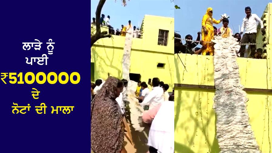 ਇਹ ਵੀਡੀਓ ਦੇਗ ਜ਼ਿਲ੍ਹੇ ਦੇ ਮੇਵਾਤ ਇਲਾਕੇ ਦਾ ਹੈ, ਜਿੱਥੇ ਨੋਟਾਂ ਦੀ ਮਾਲਾ ਪਹਿਨੇ ਲਾੜੇ ਦਾ ਵੀਡੀਓ ਸੋਸ਼ਲ ਮੀਡੀਆ 'ਤੇ ਵਾਇਰਲ ਹੋ ਰਿਹਾ ਹੈ। ਮੇਵਾਤ ਇਲਾਕੇ 'ਚ ਮੁਸਲਿਮ ਭਾਈਚਾਰੇ 'ਚ ਵਿਆਹ ਸਮਾਗਮ ਦੌਰਾਨ ਛੱਤ 'ਤੇ ਲੱਕੜ ਦੀ ਪੌੜੀ ਰੱਖੀ ਗਈ ਅਤੇ ਲਾੜੇ 'ਤੇ 51 ਲੱਖ ਰੁਪਏ ਦੀ ਮਾਲਾ ਚੜ੍ਹਾਈ ਗਈ। ਲੰਬੇ ਸਮੇਂ ਤੋਂ ਮੇਵਾਤ ਇਲਾਕੇ ਵਿੱਚ ਵਿਆਹ ਸਮਾਗਮਾਂ ਵਿੱਚ ਨੋਟਾਂ ਦੇ ਹਾਰ ਪਾਉਣ ਦਾ ਸਿਲਸਿਲਾ ਚੱਲ ਰਿਹਾ ਹੈ। ਵੀਡੀਓ ਸੋਸ਼ਲ ਮੀਡੀਆ 'ਤੇ ਵਾਇਰਲ ਹੋ ਰਿਹਾ ਹੈ।